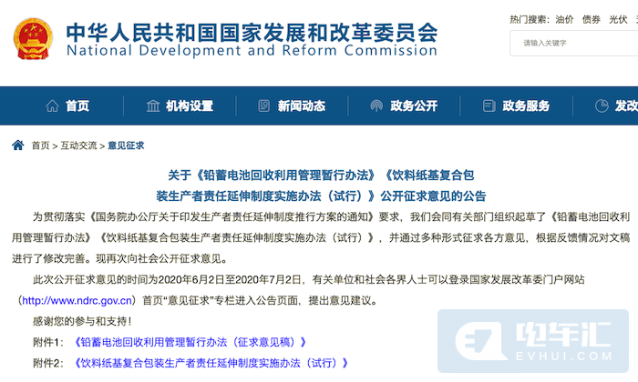 电车汇消息:6月2日,国家发改委印发《铅蓄电池回收利用管理暂行办法(征求意见稿)》征求意见,其中指出国家实行铅蓄电池回收目标责任制,到2025年底,铅蓄电池回收率要达到70%以上。铅蓄电池生产企业(含进口企业),应通过自主回收、联合回收、委托回收等方式,实现国家确定的回收目标,于每年3月底前提交上年度目标完成情况报告。