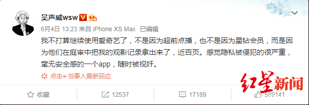 近日,爱奇艺《庆余年》超前点播案判决后,当事人吴某在微博发文称,爱奇艺在庭审中把他的观影记录拿出来了,上百页,“感觉隐私被侵犯得很严重”。很快,爱奇艺针对此事回应,此举是基于根据法律法规和诉讼需要,仅向法庭提供,并且申请了不公开质证。