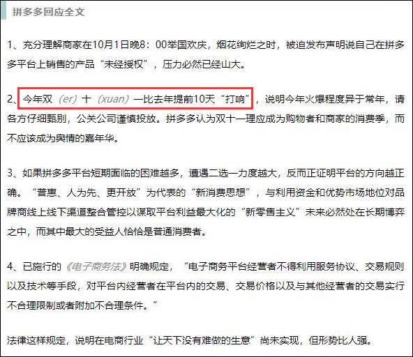 彼时拼多多回应表示,充分理解商家被迫发布声明说自己在其平台上销售的产品“未经授权”,压力必然已经山大。今年的“双(er)十(xuan)一”比去年提前了10天,电商行业“让天下没有难做的生意”尚未实现,但形势比人强。