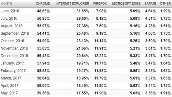 根据 NetMarketShare 的数据显示,2016 年 6 月到 2017 年 6 月,Google Chrome 的市场份额由 48.65% 增长到了 59.36%,而 IE 由 31.65% 减少到 17.55%,Edge 浏览器的占比都只不过是个位数。