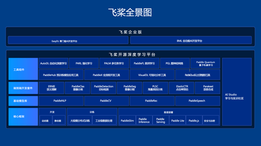 在多年的深度学习技术研究和业务应用的基础上,百度自主研发了国内首个开源开放、技术领先、功能完备的产业级深度学习平台飞桨,全方位提供给开发者、企业使用,助力各行各业的智能化升级。现在,飞桨开源深度学习平台由核心框架、基础模型库、端到端开发套件、工具组件所组成,涵盖了人工智能从开发、训练,到预测、部署的全部过程,具备开发便捷的深度学习框架、超大规模深度学习模型训练技术、多端多平台部署的高性能推理引擎、产业级开源模型库四大领先技术。