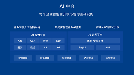 依托百度大脑全面、领先的AI能力,百度的AI中台包含AI能力引擎、AI开发平台两大核心能力以及管理平台,让企业可以拥有建设AI开发和应用的自主能力,集约化管理企业AI能力和资源,统筹规划企业智能化升级版图。