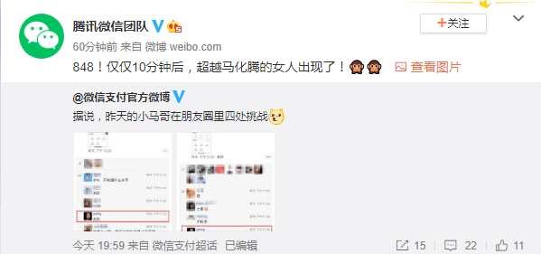 马上,@腾讯微信团队 就来了:“848!仅仅10分钟后,超越马化腾的女人出现了!”