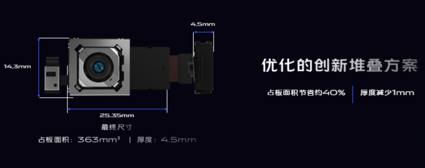 根据 vivo公布的信息,vivo X50 Pro 采用了全新的优化堆叠方案——异形结构磁动框架,在保证微云台正常使用的前提下,占板面积节省约40%,厚度减少1mm,“极限”压缩微云台与屏幕的距离至0.13mm。