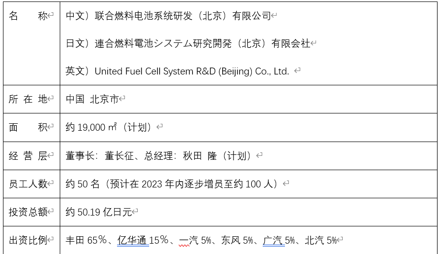 (2020年6月5日,北京)为了在中国普及氢燃料电池车(FCEV),中国第一汽车股份有限公司、东风汽车集团有限公司、广州汽车集团股份有限公司、北京汽车集团有限公司、北京亿华通科技股份有限公司、丰田汽车公司等六家拥有相同理念的公司于今日签署合营合同,成立“联合燃料电池系统研发(北京)有限公司”。该公司主要业务为在中国开展能为构建清洁环保的移动出行社会作出贡献的商用车燃料电池系统研发工作,以丰田和亿华通为主,由各公司共同出资。计划由董长征担任董事长,秋田隆担任总经理,预计于2020年内在北京正式成立。
