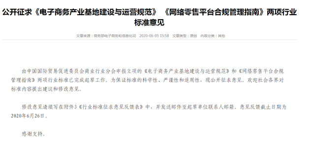 6月5日下午消息,商务部官网发布公告称,由中国国际贸易促进委员会商业行业分会申报立项的《电子商务产业基地建设与运营规范》和《网络零售平台合规管理指南》两项行业标准已完成起草工作。为保证标准的科学性、严谨性和适用性,现公开征求意见。欢迎社会各界对标准内容提出建议和修改意见。