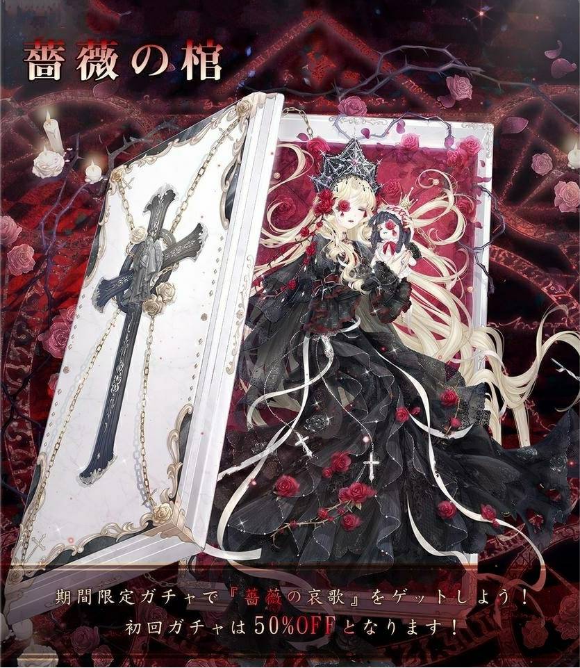 蔷薇的棺是日服套,或许是由于国服暗黑风格套装较少的原因,外服的暗黑风格可谓是一套比一套惊艳,而蔷薇的棺这套则是最出类拔萃的一套。这一套无论是棺材形状的盒子还是主人公黑色的大长裙都非常亮眼,主人公右眼的玫瑰花可谓是点睛之笔。