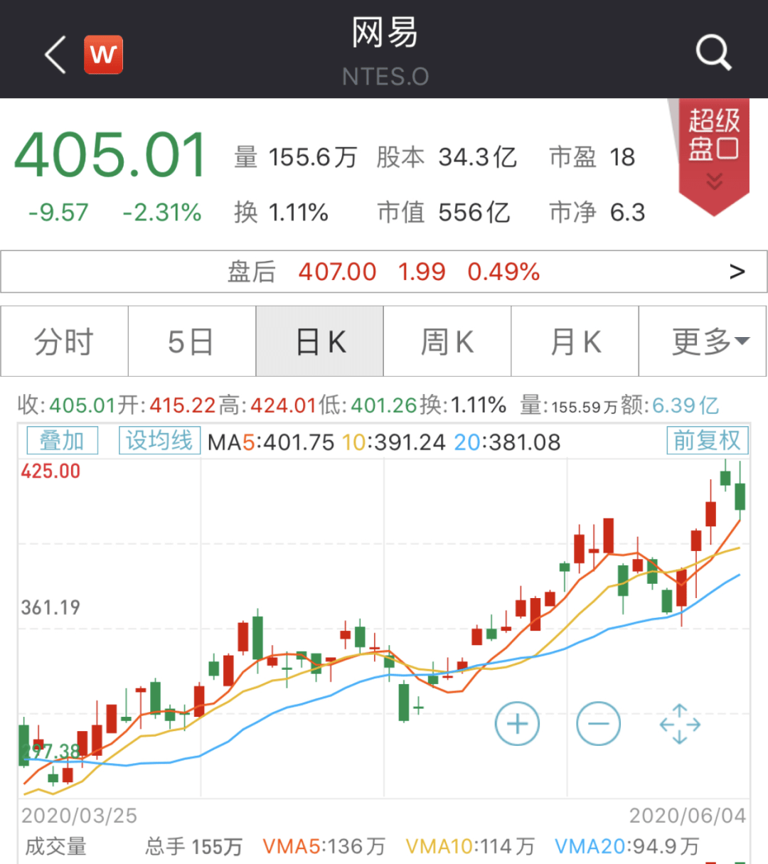 截至北京时间今晨美股收盘,网易报于每股405.01美元,较前一交易日下跌2.31%,市值为556亿美元。