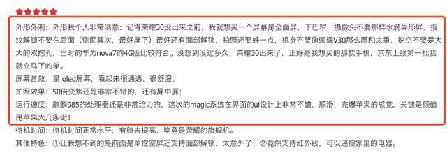在保持高销量的同时,荣耀30系列的用户口碑也是同样出色。“外观设计好看,很有个性”;“拍照出色,50倍变焦非常给力”;“性能强劲、玩游戏不卡”等等,这些用户评价都充分展现了消费者对于荣耀30系列的认可。
