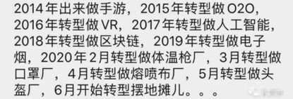 回顾过往,风口的变化就是一部经济变迁史。正如网上一则段子所言:“2014年出来做手游,2015年转型做O2O,2016年转型做VR,2017转型做人工智能,2018年开始转型做区块链……”