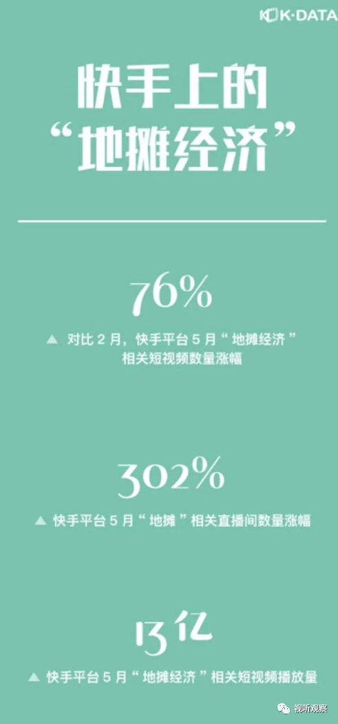 而快手也发布了“地摊经济相关数据,相比2月份,2020年5月份快手上“地摊”相关的直播间数量涨幅高达302%