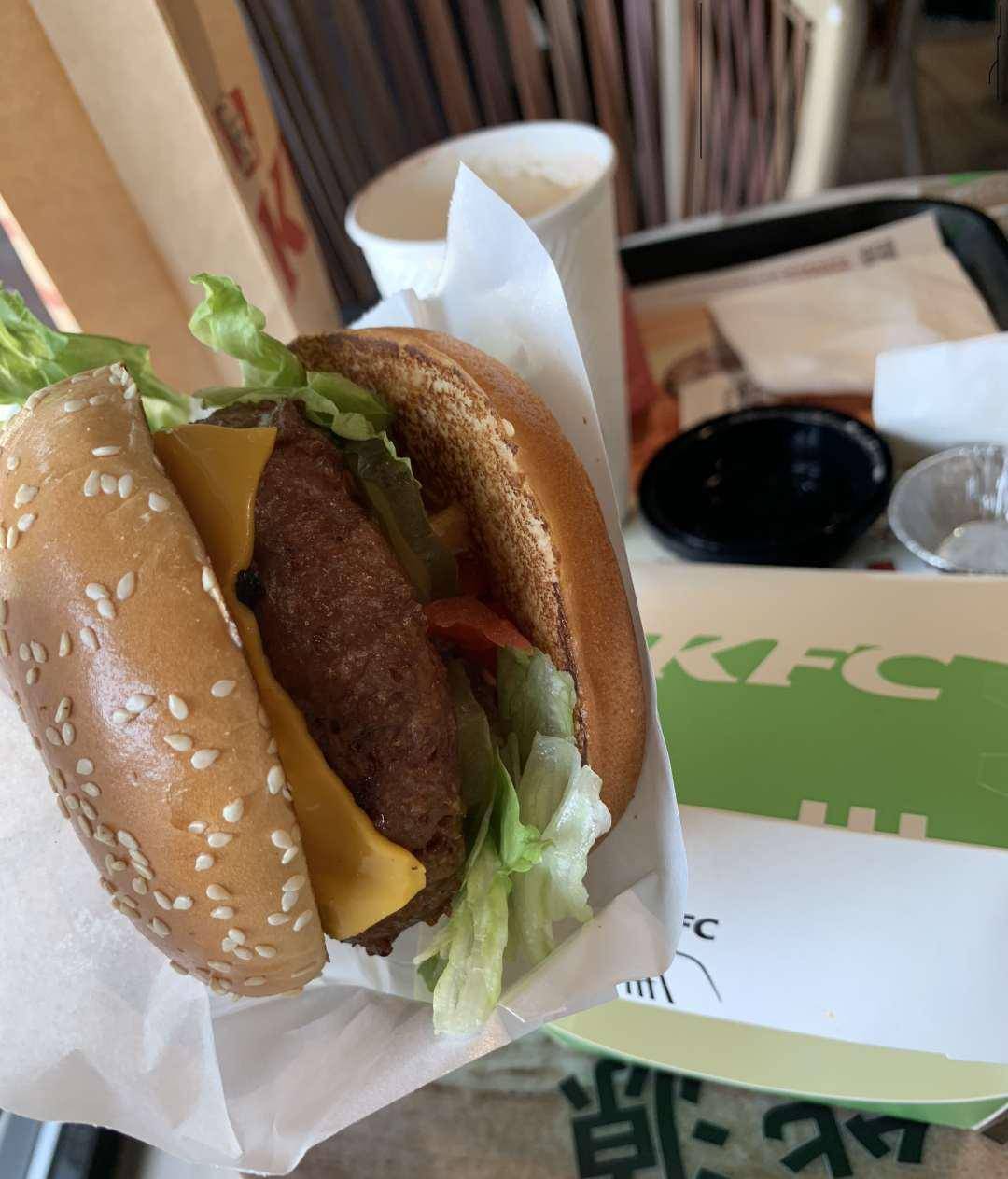 6月4日,在肯德基宣武门餐厅,记者现场购买并品尝了这款“不一样”的汉堡。从外观和口感来看,这款植物肉汉堡足以乱真。不过,点这款汉堡的人看似不多,多半是被近40元人民币的价格吓到了。
