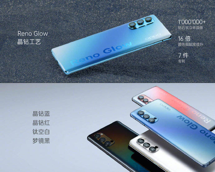 外观方面,OPPO Reno4 Pro将厚度进一步减薄至约7.6mm,整机仅重约172g,中框最薄处仅2.7mm左右。OPPO Reno4系列拥有晶钻红、晶钻蓝、钛空白、梦镜黑四款全新配色,其中晶钻红、晶钻蓝和钛空白三款配色,更是独家首发Reno Glow晶钻工艺,机身后盖有百万级闪钻晶面凝练一体,能既保留机身色彩的细腻与亮度,同时又不沾指纹、更耐磨。