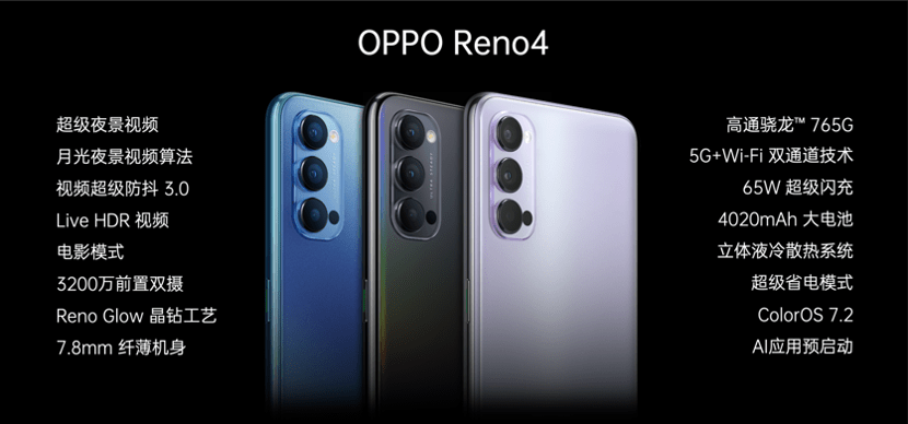 此次发布会上,OPPO还发布了OPPO Reno4,同样搭载高通骁龙™ 765G 5G芯片及65W超级闪充;后置搭载4800万+800万+200万超清激光对焦三摄,前置双摄为3200万+200万组合,具备超级夜景视频、视频超级防抖3.0等视频拍摄功能。