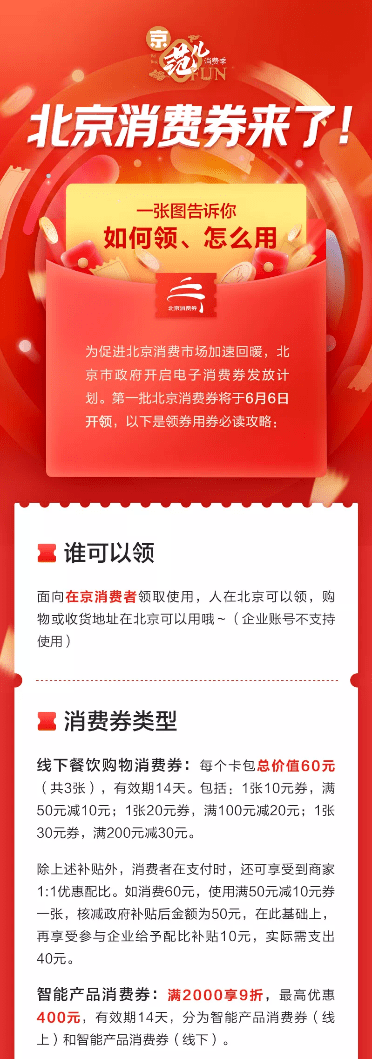 在6月6日,北京市首批将发放300万张消费券,包括200万张专项消费券和100万张智能产品消费券,先到先得,领完为止。领后14天内可在线上、线下参与活动的商家进行消费使用。6月5日起,在京消费者即可登陆京东App预约领取消费券。
