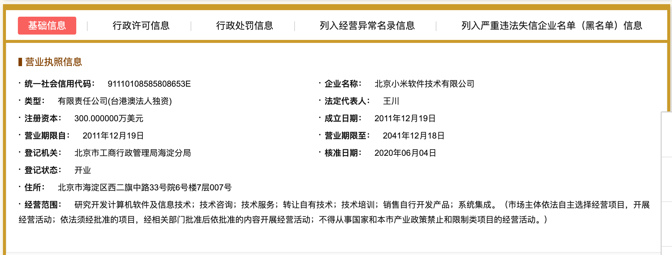新京报讯 企查查数据显示,6月4日,北京小米软件技术有限公司发生工商变更,林斌卸任法定代表人,王川接任,同时任经理职位。
