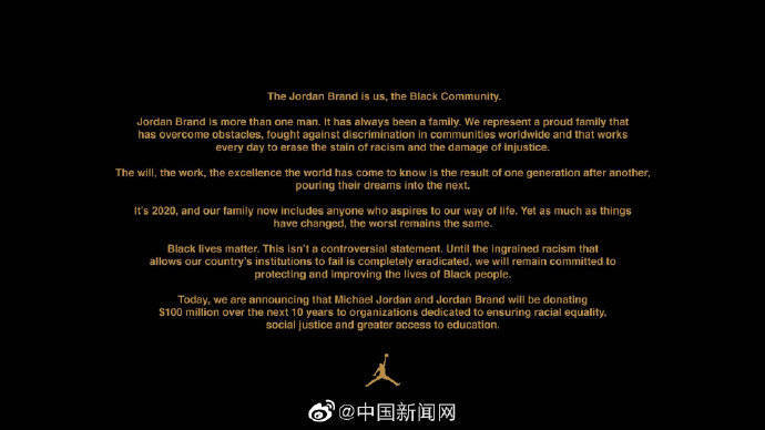 【乔丹捐1亿美元用于支持种族平等】北京时间6月6日,美国篮球巨星乔丹以及他的旗下品牌Jordan发表声明,承诺在未来的十年之内将捐出1亿美元,用来支持"种族平等、社会正义和更多的受教育机会"。乔丹品牌在声明中称:“黑人的命也是命。这不是一个有争议的说法。在彻底根除使我们国家机构衰败的、根深蒂固的种族主义之前,我们将继续致力于保护和改善非裔的生活。”