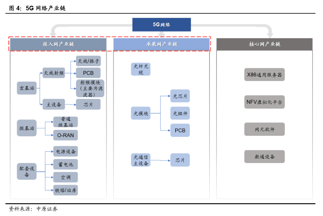 首先从5G网络看,宏观上5G 网络产业链一共可以分为三个领域,和通信网络架构一一对应,分别是接入网产业链、承载网产业链和核心网产业链。