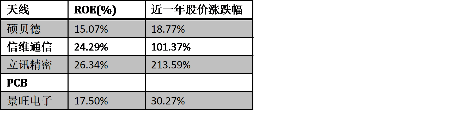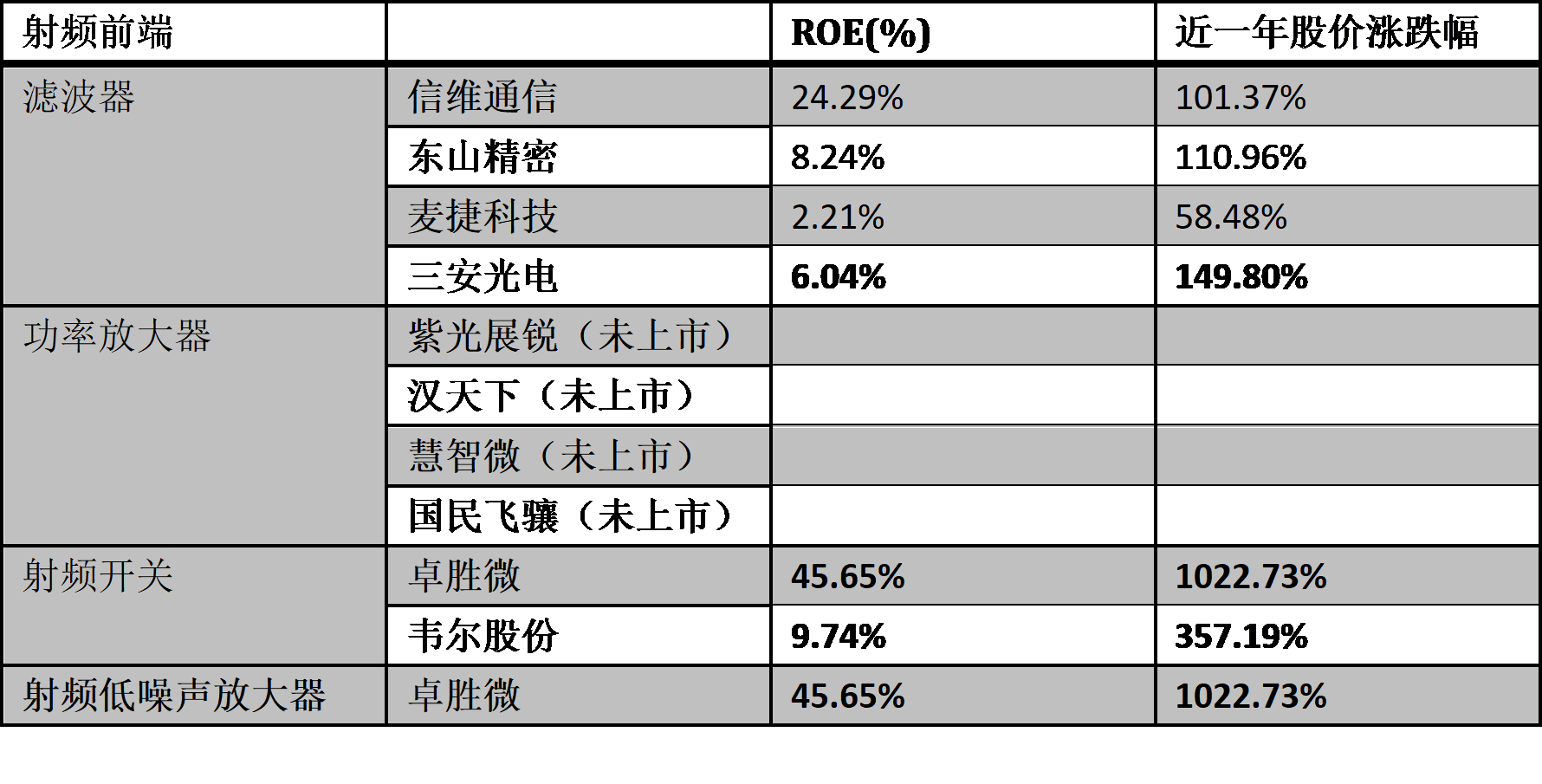 而相比于5G网络部分的有涨有跌,5G终端的设备制造商无论是ROE,还是股价变化,均表现出正向的增长趋势。时代财经统计的9家5G终端产业链公司中,有6家公司过去一年股价涨幅超100%,射频前端供应商卓胜微更是暴涨1022.73%。合计来看,5G产业链有近四成公司股价翻番。
