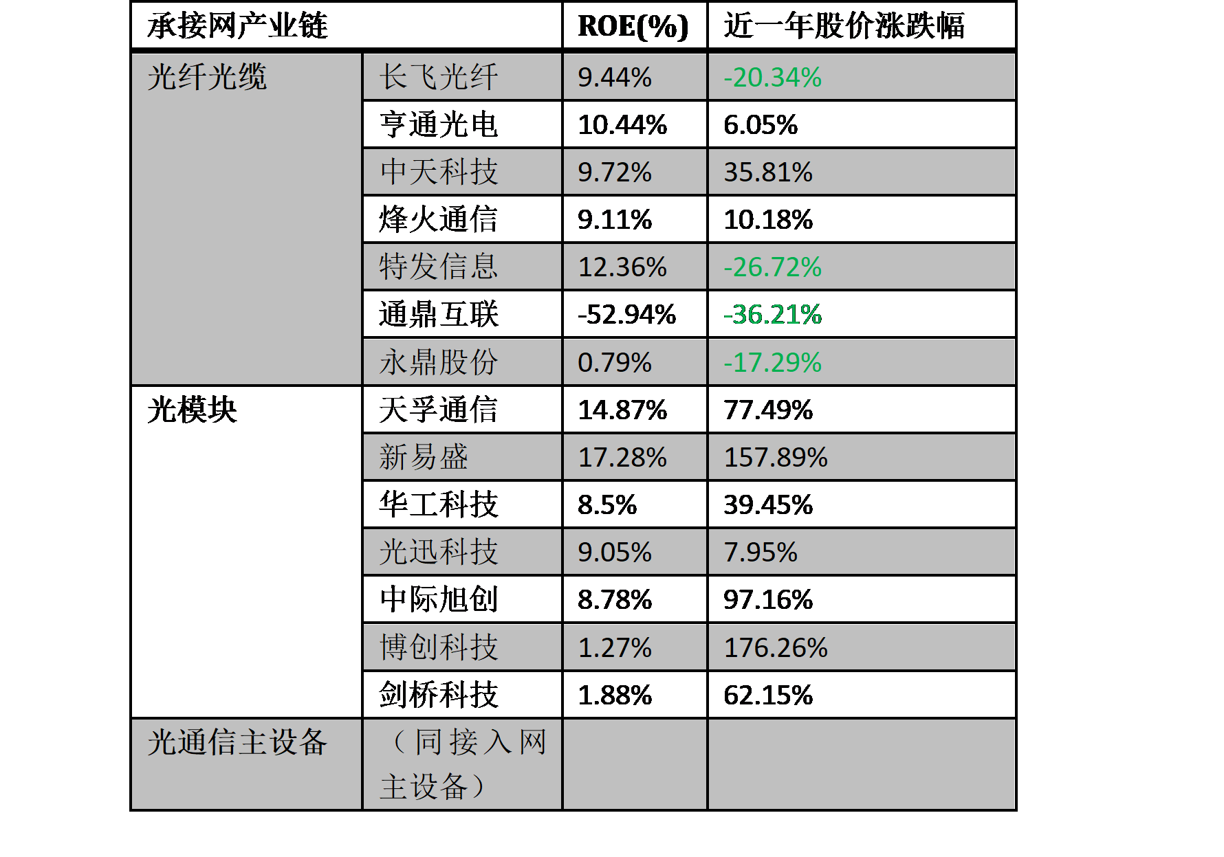在5G网络部分,时代财经统计了A股37家产业链企业6月4日的ROE和近一年来的股价涨跌幅。过去一年,产业链企业股价不涨反跌的有12家,占比32.4%,也有7家涨幅超过100%,分别为飞荣达、东山精密、风华高科、新易盛、博创科技、宝信软件、数据港。