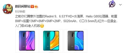核心配置上,Redmi 9搭载了联发科中端处理器Helio G80 芯片,此外手机还配备了3.5mm耳机接孔与红外灯,配备了Type-c接口和5020毫安时的电池。