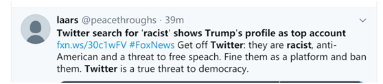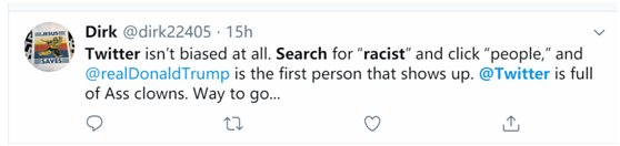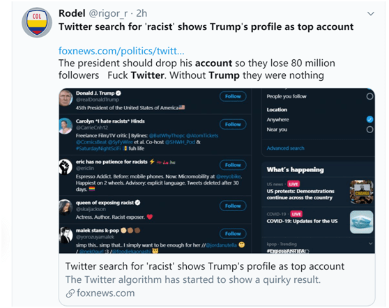 “福克斯新闻”表示,搜索“种族主义(racist)”发现特朗普的推特账户出现在“用户”标签下第一个位置。即使在匿名模式或者在没有登录推特账户的情况下进行搜索,结果仍旧相同。