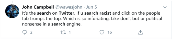 “这就是推特上的搜索。如果你搜索种族主义,点击用户,特朗普出现在顶部。这太让人生气了。”
