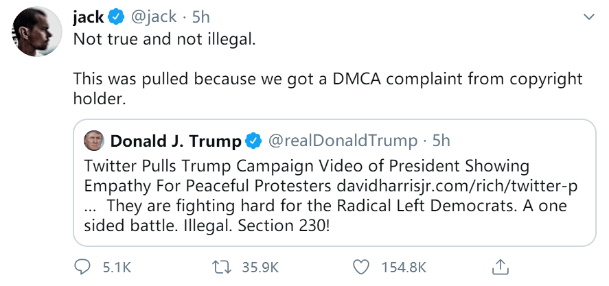 稍晚些时候,杰克·多尔西在推特上转发了特朗普这条推文,并作出回应。他写道,“(相关指控)不合乎事实,(推特移除视频)也不是非法的。这是因为我们收到了来自版权所有者的DMCA(美国千禧年数字版权法)投诉。”