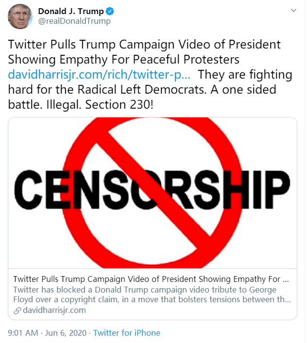 他转发了一则关于“推特移除‘特朗普表现出对和平抗议者感同身受’的竞选视频”的报道并写道:“他们正在为激进的左翼民主党人努力抗争。而这完全是一边倒的抗争。非法!”在推文最后,特朗普还提及美国《通讯正当行为法案》(CDA)第230条。↓