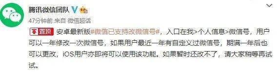 腾讯微信团队昨天中午发消息称,安卓最新版微信已支持改微信号,入口在我>个人信息>微信号,用户可以一年修改一次微信号,如果用户最近一年有自定义过微信号,期满一年后也可以更改,iOS用户亦即将可以使用该功能。如果暂时还改不了,请大家稍等再试试。