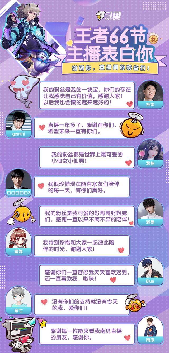 以前我们只知道,有王者五五开黑节。但没想到的是,斗鱼竟然推出了王者66节。其实说白了,这就是一个主播向粉丝答谢的活动了。拖米、Gemini、温柚、白白白白白3、blue、骚易、雷婷、音七、南瓜这9位主播集结,向粉丝表白,每一位都真情流露,情真意切,让粉丝感动满满。