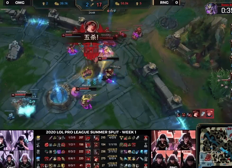 24分钟RNG战队在中路开团,SMLZ瞬间暴毙,RNG战队大获全胜。最后Icon佐伊成全对手,回头送给Betty女枪五杀,RNG战队赢下第一场比赛的胜利!