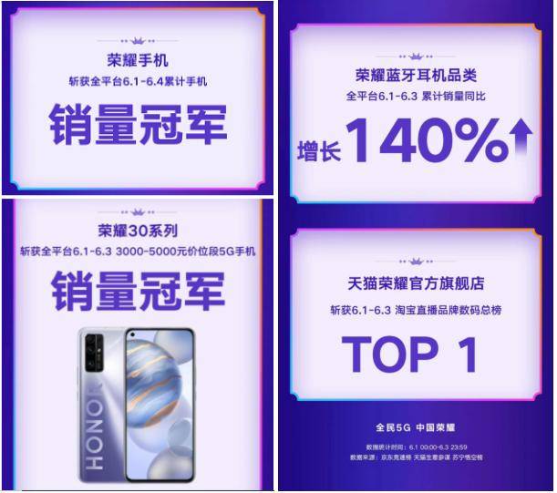 在此次618大促中,荣耀30系列凭借着强大实力获得用户喜爱,接连斩获销冠。6月2日荣耀30斩获全平台2500—3500元价位段5G手机销量冠军,荣耀30系列6.1-6.3日连续斩获全平台3000—5000元价位段5G手机销量冠军,助力荣耀手机蝉联6.1-6.4全平台累计手机销量冠军。