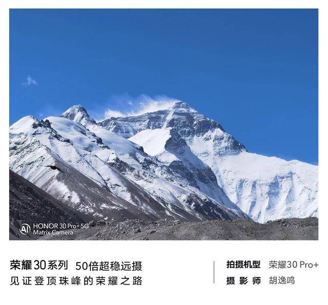 荣耀30还搭载了潜望式手持超稳远摄镜头,支持5倍光学变焦、10倍混合变焦和50倍数字变焦,能够轻松拍摄远距离的景物。而荣耀独创的双结构OIS光学防抖技术、AI长焦超级防抖算法、长焦画中画功能的加入,也让手持拍照更稳定、取景更方便,全方位提升了拍照体验。因此,全系搭载50倍超稳远摄的荣耀30系列,也利用长焦镜头助力中国登山队员,完成了珠峰峰顶的苍凉美景拍摄。