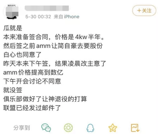 在知乎网友爆料没多久,微博上有名网友接着知乎网友的料继续抖瓜,微博网友表示:Uzi本来准备签合同,加个是4000W半年,签之前Uzi女友让Uzi要RNG股份,白心也同意了,但签之前出现变数,Uzi女友将加个提高到数亿,RNG没用同意导致Uzi退役。