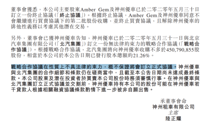 第二,神州租车董事会被大股东神州优车告知,神州优车已于5月31日与北汽集团签订了一份无法律约束力的战略合作协议,北汽集团或将收购神州优车持有的神州租车所有股份。