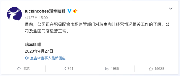 4 月 27 日,有媒体报道称,证监会派出调查组进入瑞幸,同时公安、工商等介入,高管被查,资料上交。对此,瑞幸官方当天的回应是:
