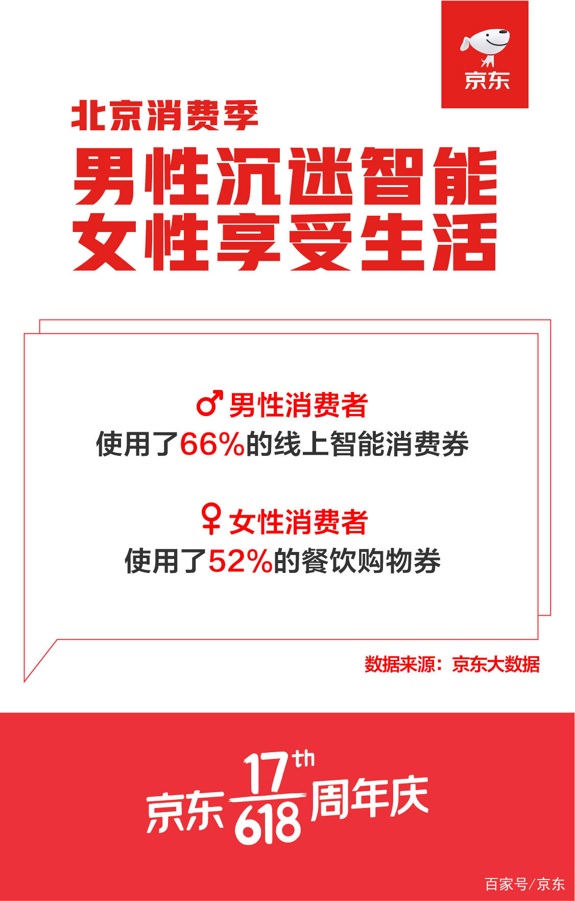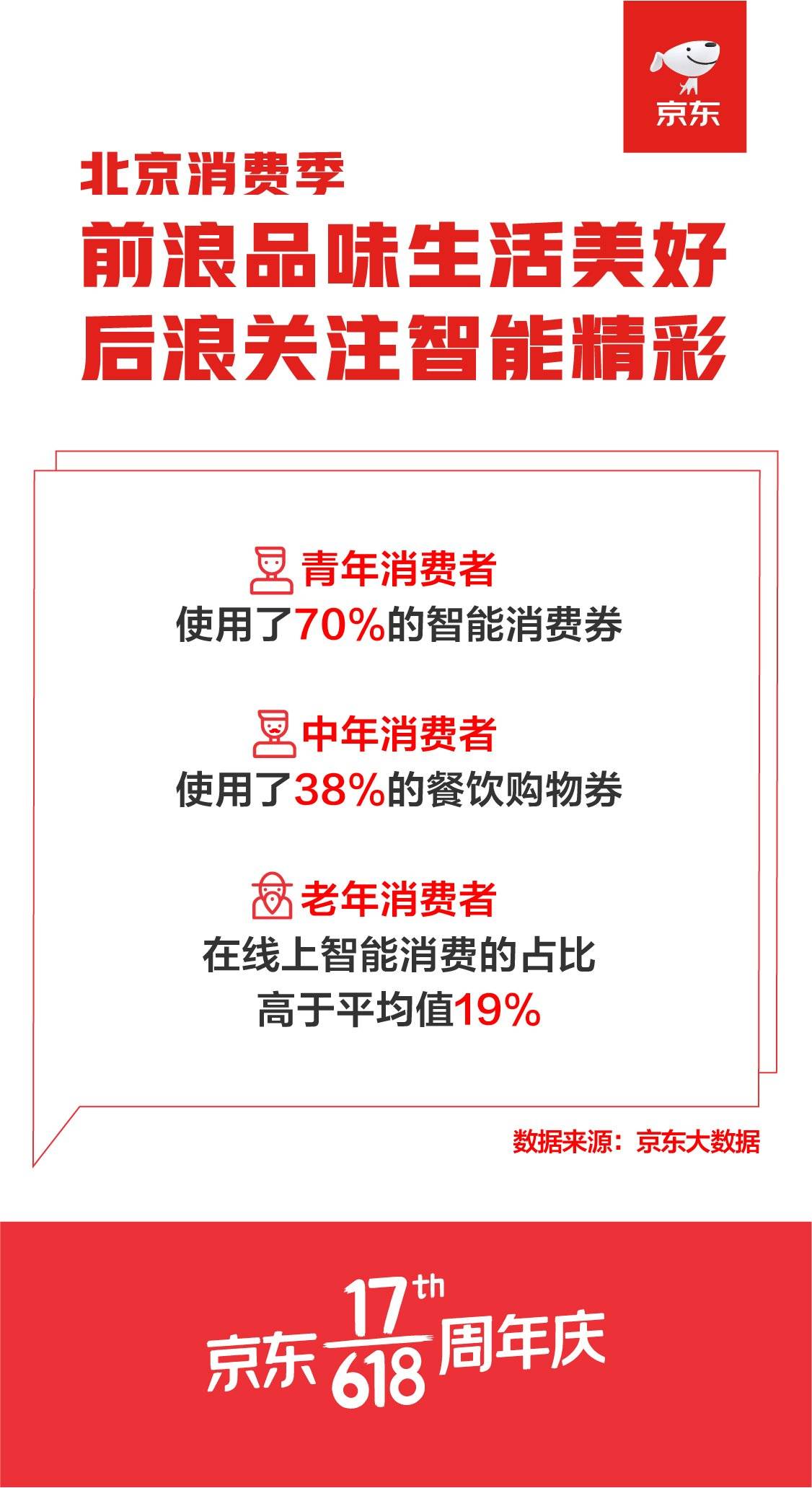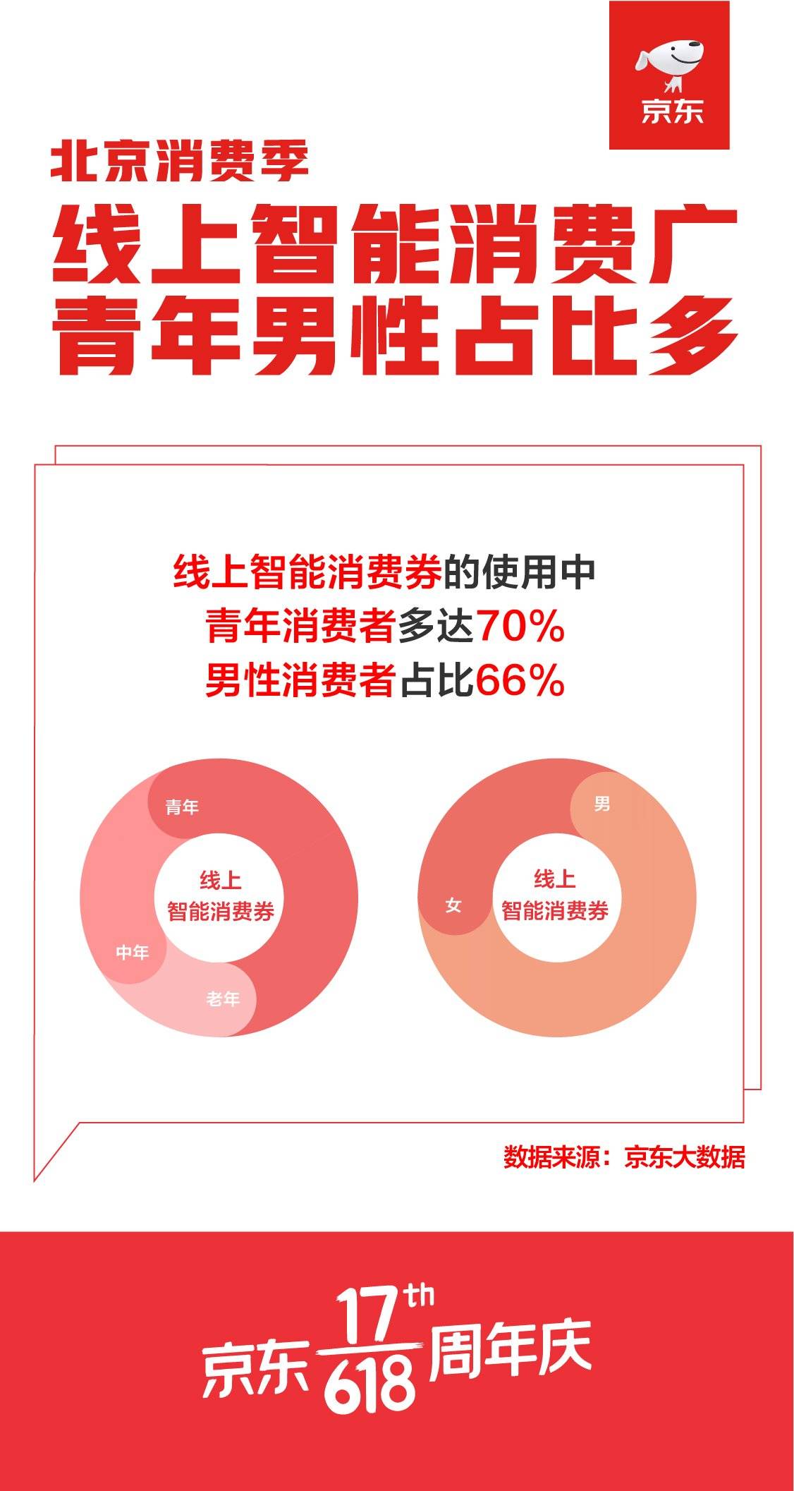 从京东大数据显示的年龄结构看,青年消费者的餐饮购物券、智能消费券使用率分别达到59%和70%,年轻人群体是消费券的核销主力,尤其年轻男性在线上智能消费占比接近70%。