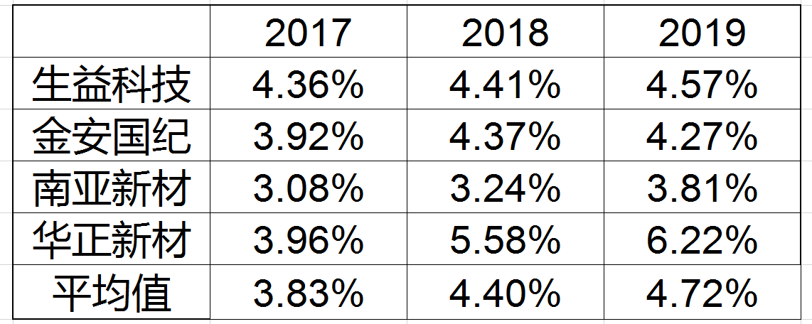 从表中可以看出,南亚新材研发费用率低于可比公司和行业平均值,并且在2018年和2019年,与可比公司研发费用率的差距进一步拉大。