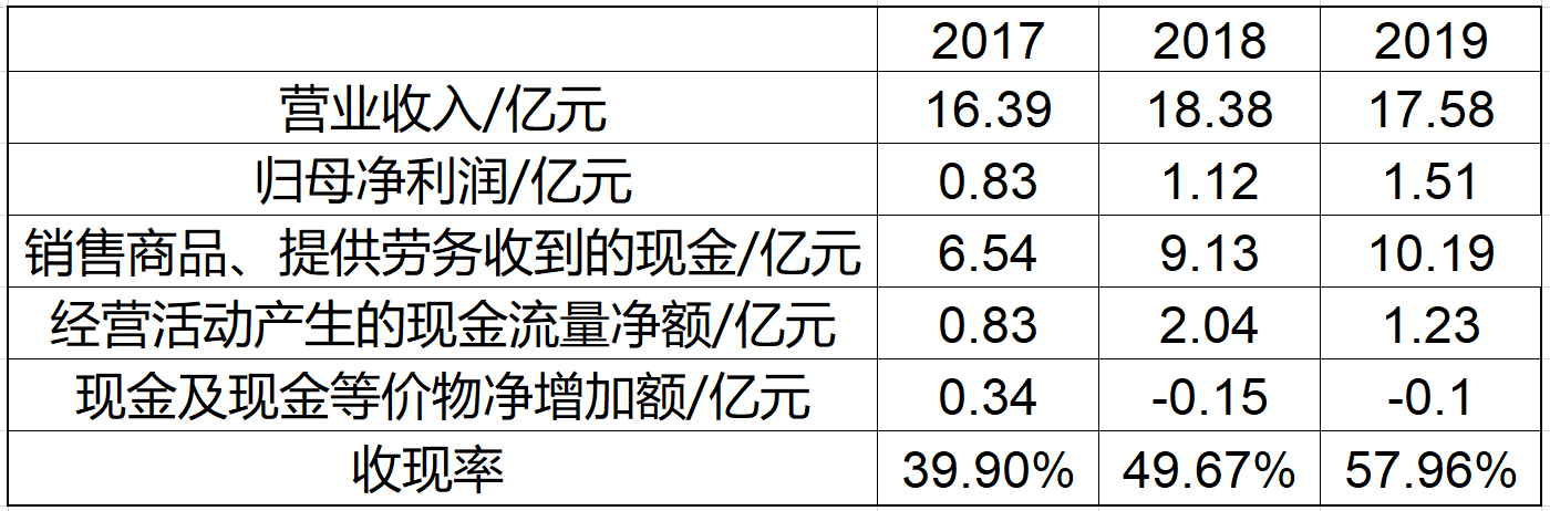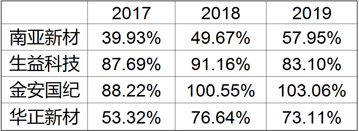 南亚新材收现率也较低,2017-2019年收现率分别为39.93%、49.67%、57.95%,表明南亚新材每年超过40%的收入没有收回现金,是作为应收账款存在着。同时,南亚新材的这一指标也远低于可比公司,也就是说,南亚新材的回款能力远低于可比公司。