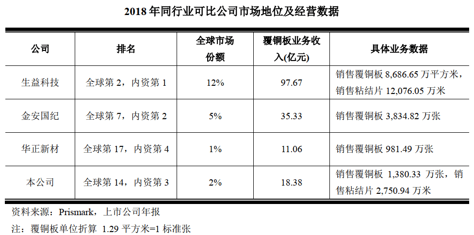 公司主要产品为覆铜板和粘结片,是国内覆铜板领域第三大厂商,是全球第十四大厂商,全球市占率为约2%。