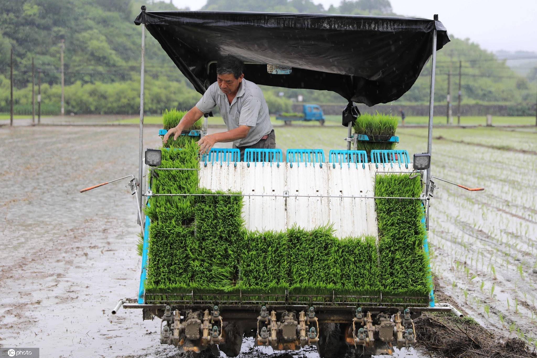6月4日,在浙江省杭州市临安区天目山镇九里村粮食功能区,农民驾驶插秧机在栽插水稻秧苗。游戏网