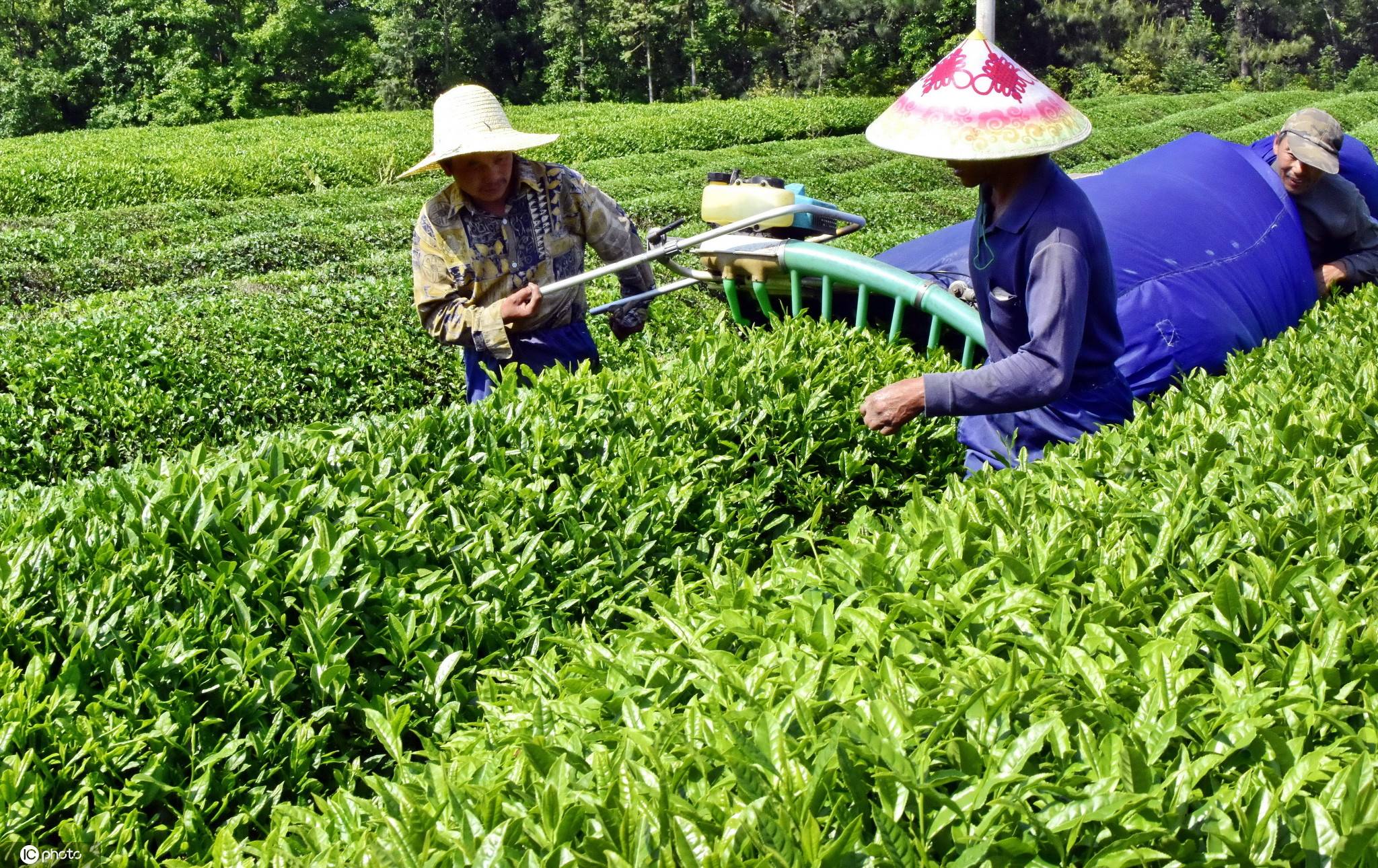 2018年4月12日,在江西省金溪县秀谷镇冠峰村千亩有机茶园里,茶农们忙着用采茶机采收茶叶。据悉,一台采茶机每天能采摘鲜茶3000多公斤,相当于100多名采茶工手工采摘一天的量。