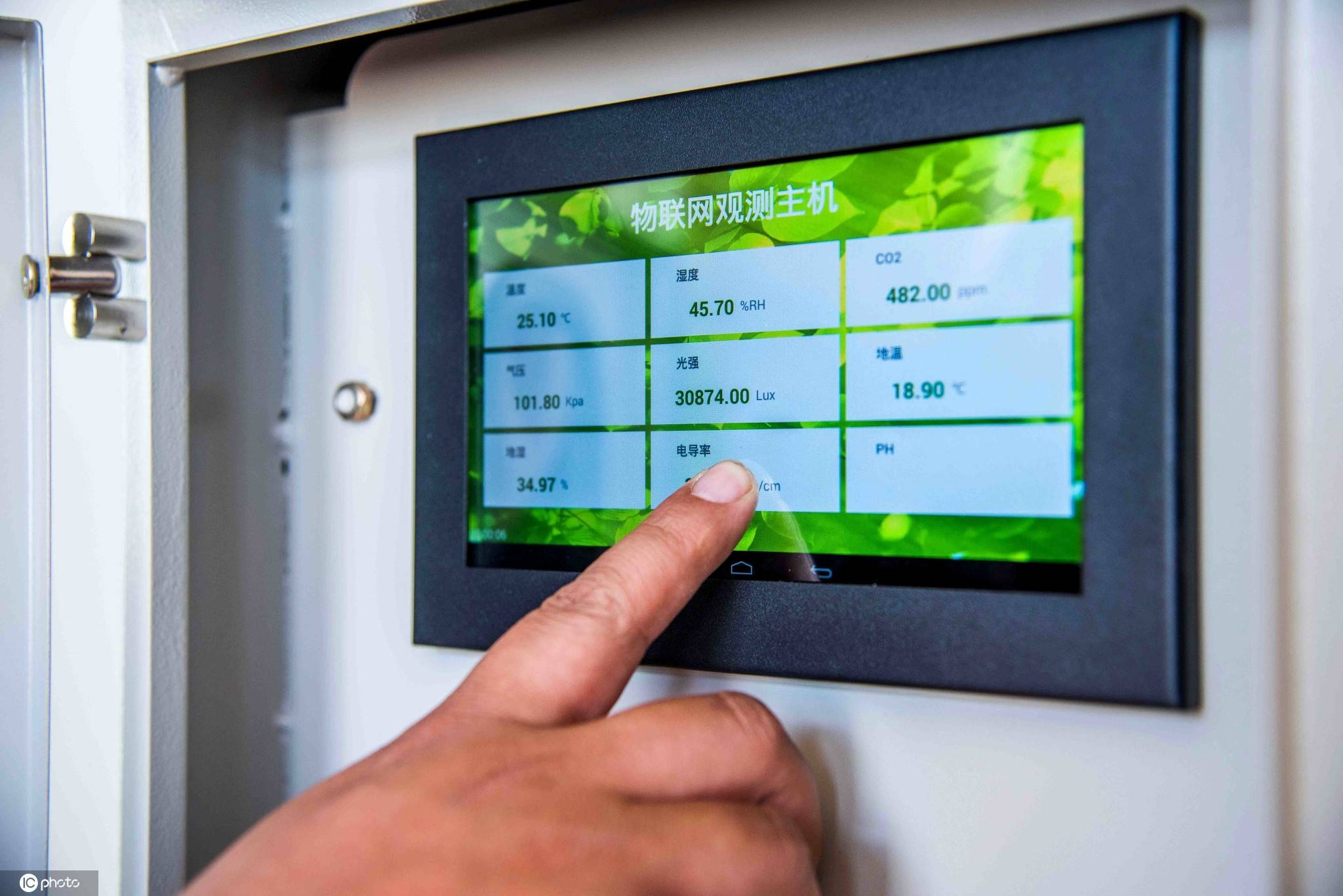 2020年4月22日,青州市何官镇南小王村晟丰农业生态园的工作人员通过物联网观测主机查看蔬菜大棚里气温、湿度等实时数据。