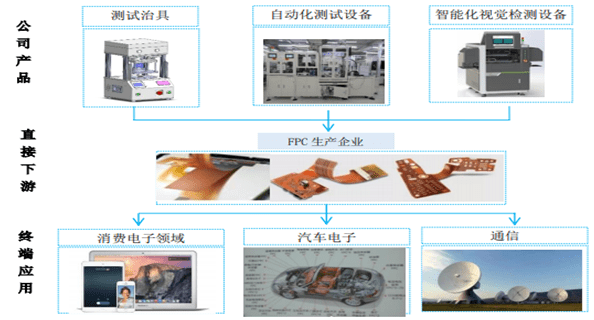 经过多年的研发和实践经验的积累,燕麦科技在自动化测试、智能化测试领域积累了丰富的技术经验和自主创新能力,在软件、硬件、结构设计等方面具有竞争优势,在精密机械、自动化控制、测试测量、机器视觉、人工智能等领域形成多项自主研发的核心技术成果。公司产品主要包括测试治具、自动化测试设备、配件及其他等,所测试FPC的终端应用领域主要集中在以苹果公司为主的消费电子领域。目前燕麦科技主要产品及其应用情况如下: