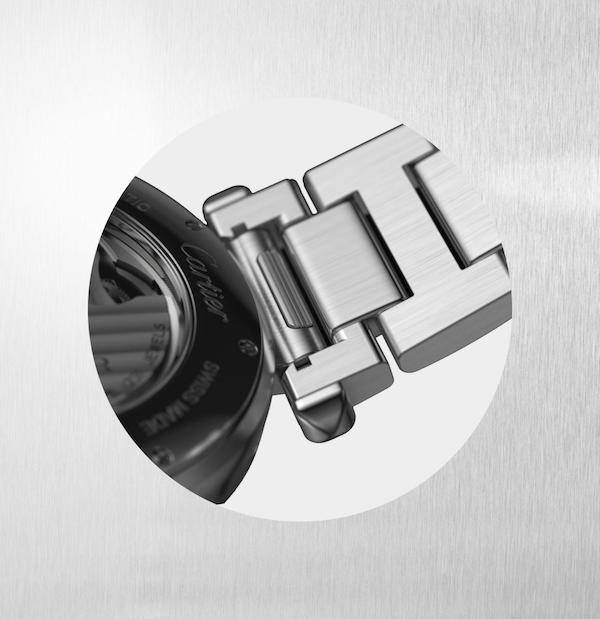 表冠通过短链固定,设计独到,更可在侧边空间镌刻字母。