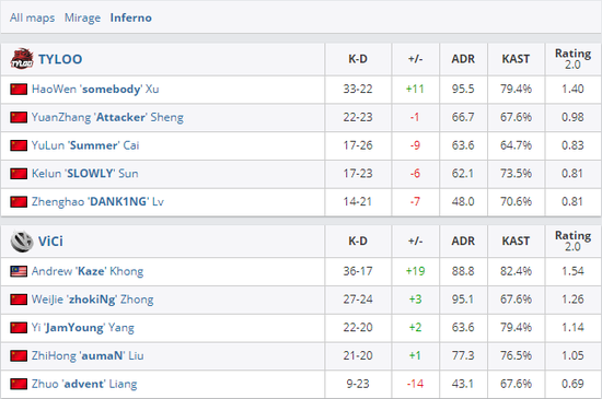在第二张地图Inferno上,TYLOO除去手枪局外保守的防守方式让他们吃了不少苦头,VG多次轻松完成香蕉道及中路控制后通过爆弹拿下了包点。不过TYLOO更多次的失利还是因为缺乏配合与冲动,将太多旗鼓相当的残局拆分为一打多无奈告负。