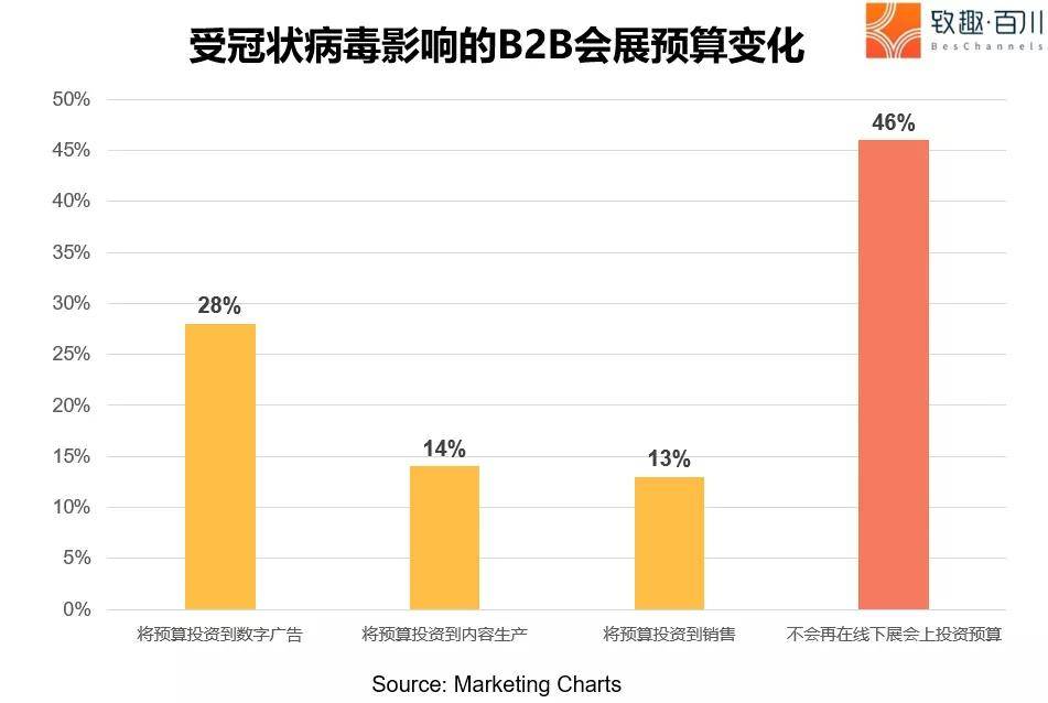 活动通常会消耗B2B营销预算的50%到60%。Marketing Charts对200多家B2B营销人员的调查显示,工业营销人员对于受影响最严重的线下展会渠道,不会再进一步投入预算。