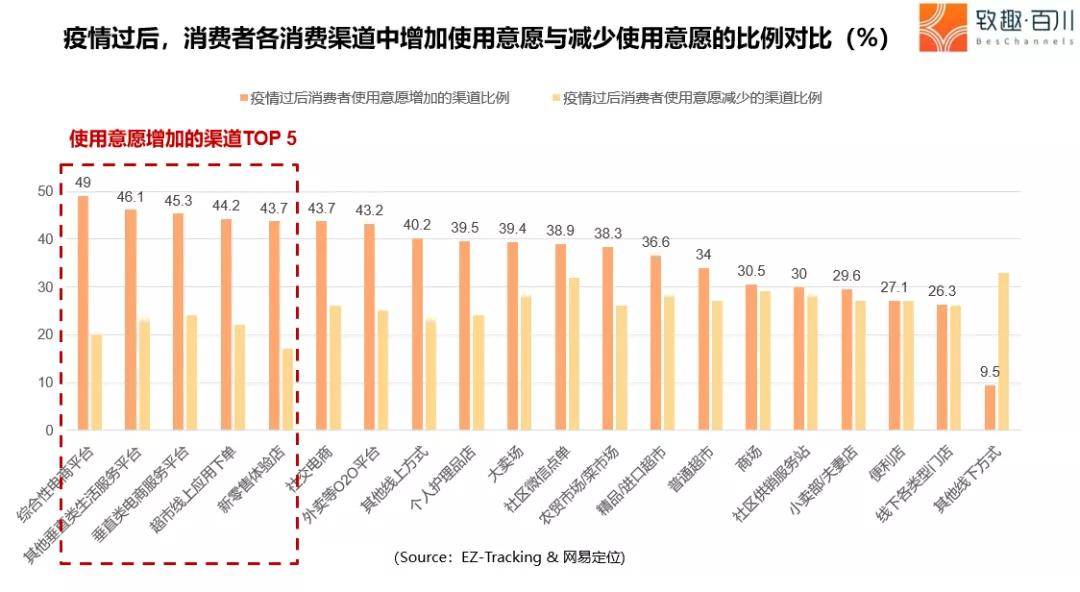 Econsultancy的调查中,87%的营销商表示,客户不愿安排面对面的会议。CTR数据显示,疫情期间,消费者转变为线上购物,超市线上应用下单、垂直类电商平台、社区微信点单在疫情期领衔线上渠道使用增长,减少使用的均为线下渠道。