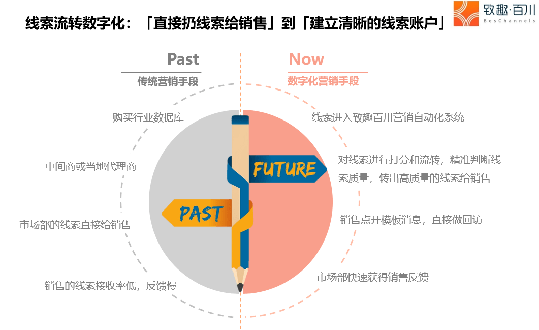 市场部获取的大量线索,以前不筛选就直接扔给销售部,线索接受率低。但通过数字化系统的搭建,所有的线索都会在致趣百川营销自动化系统中完成打分和流转,精准判断线索质量,只转出高质量的线索给销售。